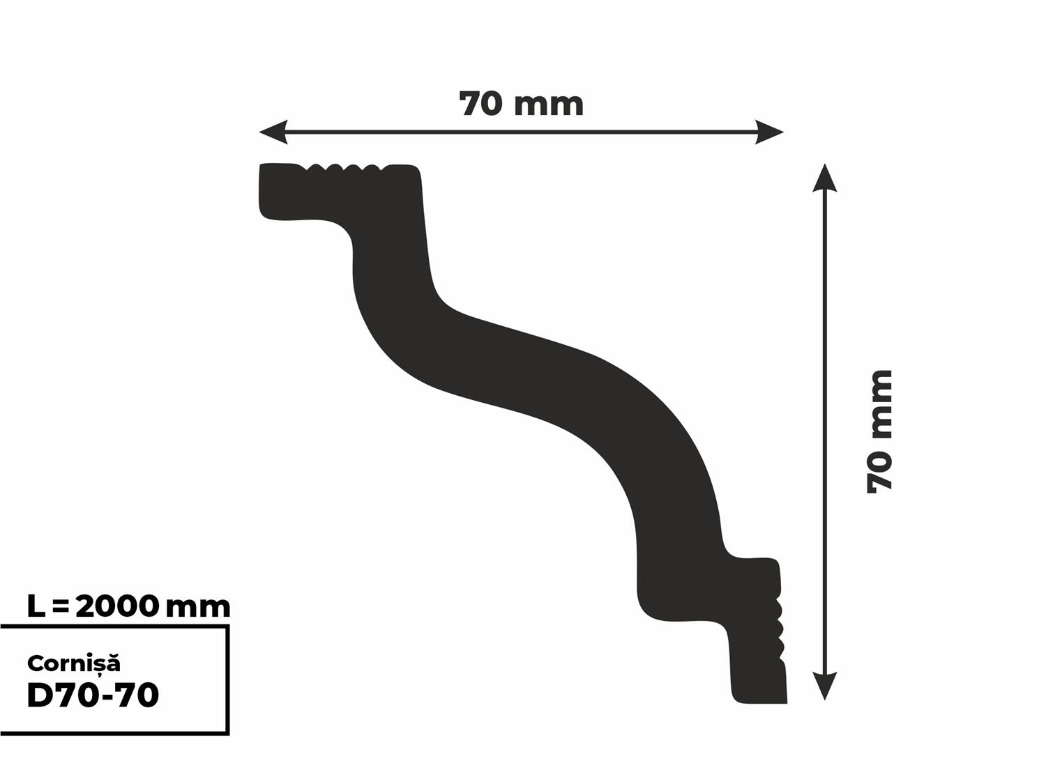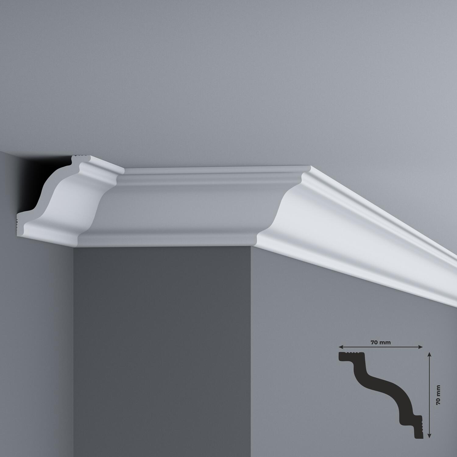 Cornisa decorativă D70-70, realizată din polistiren de înaltă densitate, este un profil elegant și versatil, ideal pentru finisarea spațiilor interioare. Această cornișă albă mată oferă un aspect modern și rafinat, fiind foarte ușoară, rezistentă și simplu de montat. Materialul permite vopsirea în orice culoare, adaptându-se perfect stilului încăperii și fiind ideal pentru mascarea imperfecțiunilor dintre tavan și perete. Mai multe informații în descriere.